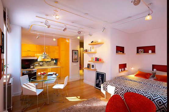 Самая большая комната квартиры грамотно разбита на зоны: спальню, гостиную и кухню. В стену напротив кровати интегрирован биокамин, а сразу над ним находится телевизор. Стены, окрашенные в белый цвет, дополнены картинами и полками для книг.