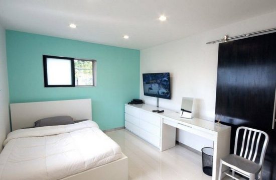 - Если дверь расположена в длинной стене, у второй узкой стены можно поставить для равновесия книжный шкаф или туалетный столик и стеллаж.